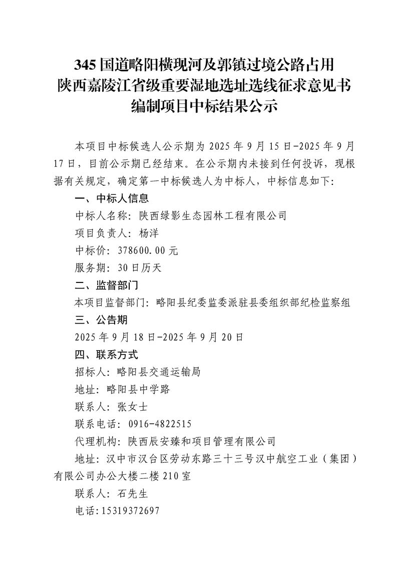 内容概述 | 345国道略阳横现河及郭镇过境公路占用陕西嘉陵江省级重要湿地选址选线征求意见书编制项目中标结果公示 |