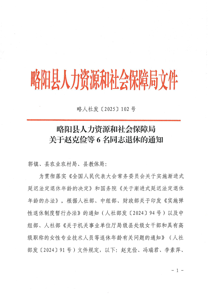 星空体育首页app人力资源和社会保障局关于赵克俭等6名同志退休的通知