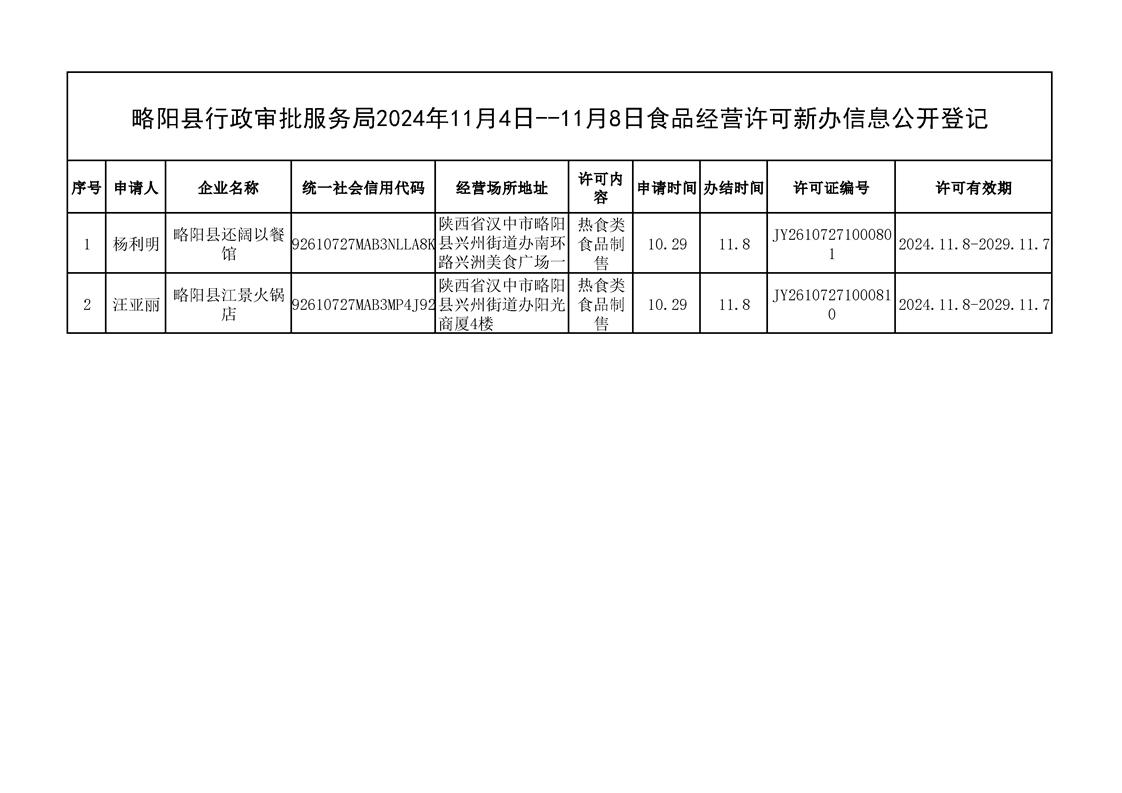 星空体育首页app行政审批服务局2024年11月4日--11月8日食品经营许可新办信息公开登记