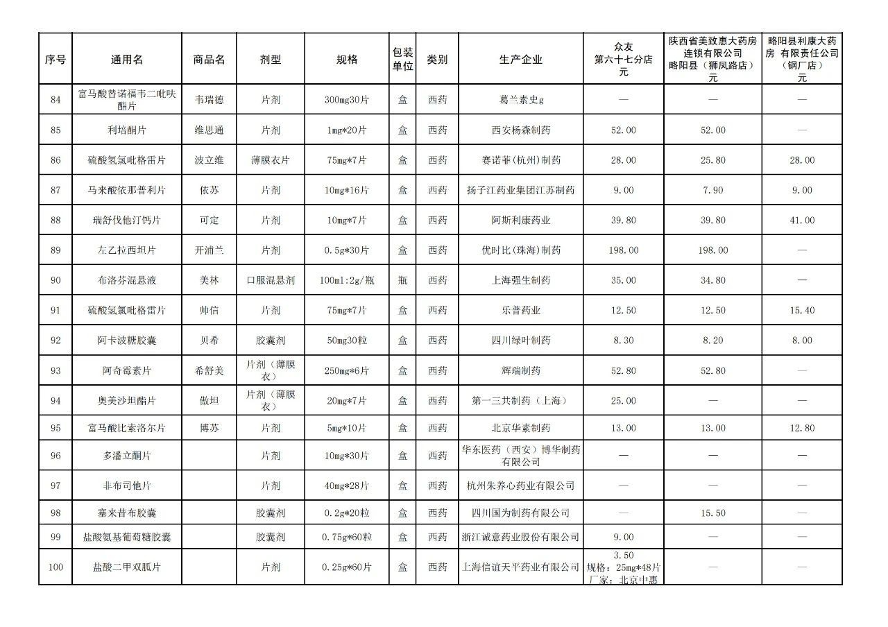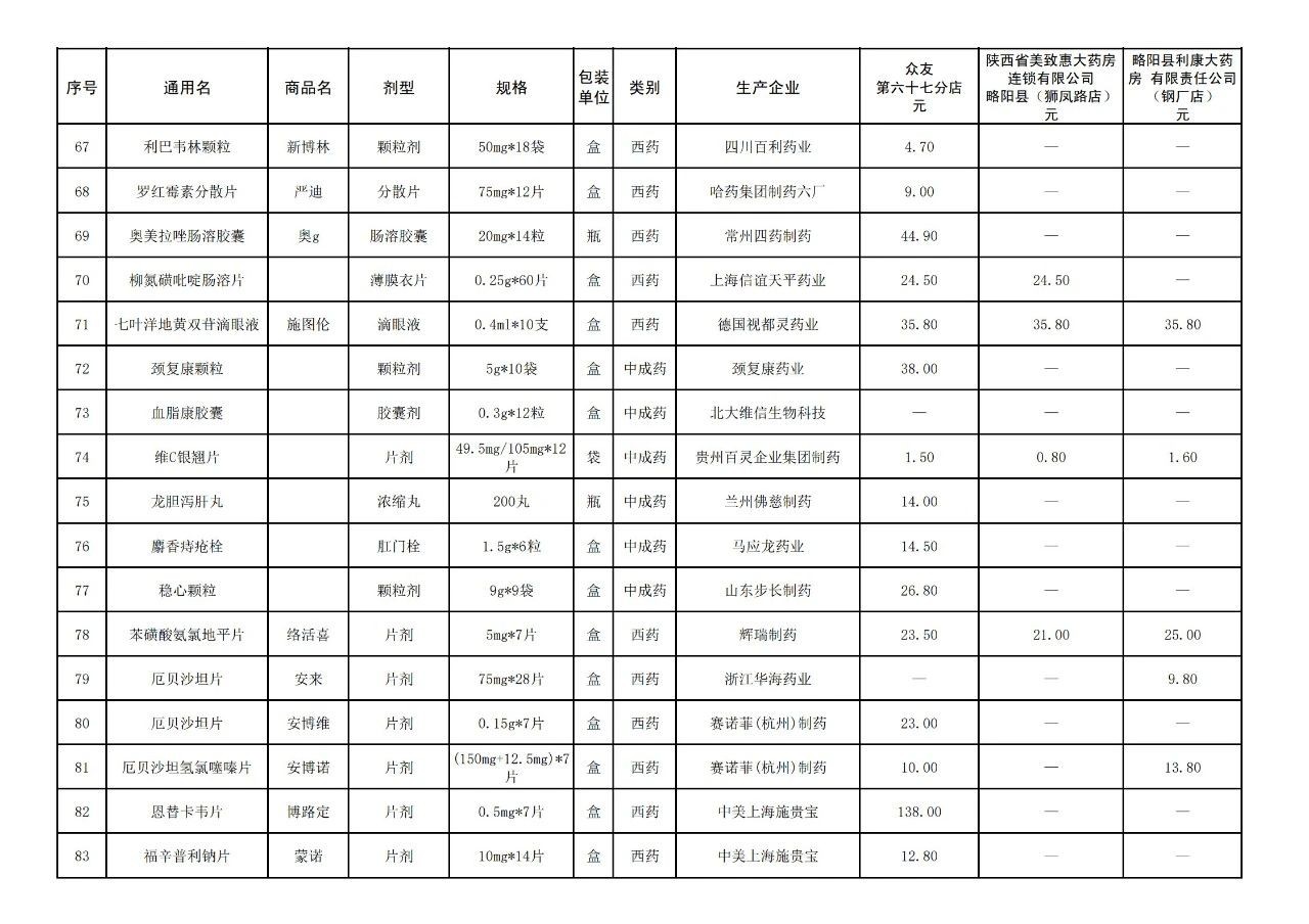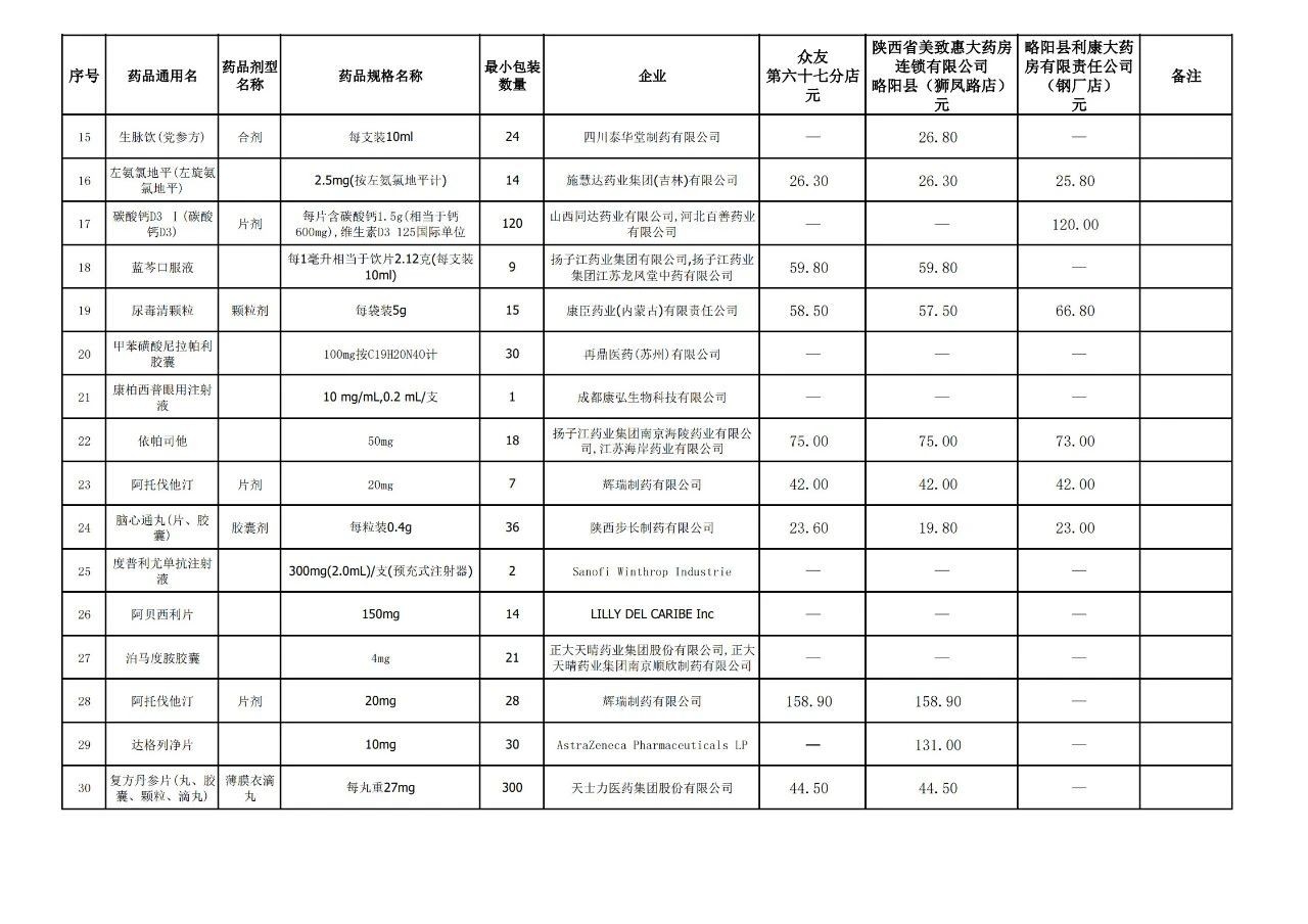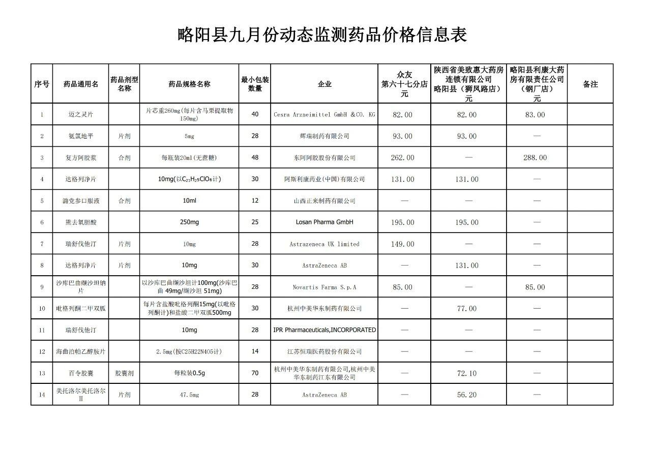 为了让人民群众切实享受到医保体制改革的成果,充分发挥医保对药品价格的引导作用,按照市医保局《关于药品价格监测有关工作的通知》要求,9月份持续对3家定点医药机构基本药品、市场销量较大药品、以及社会关注度高的药品价格进行监测。星空体育首页app医保局将药品价格监测与信息发布作为为群众办实事的重要举措,欢迎广大参保群众继续关注我县定点医药机构药品价格监测信息的发布。
