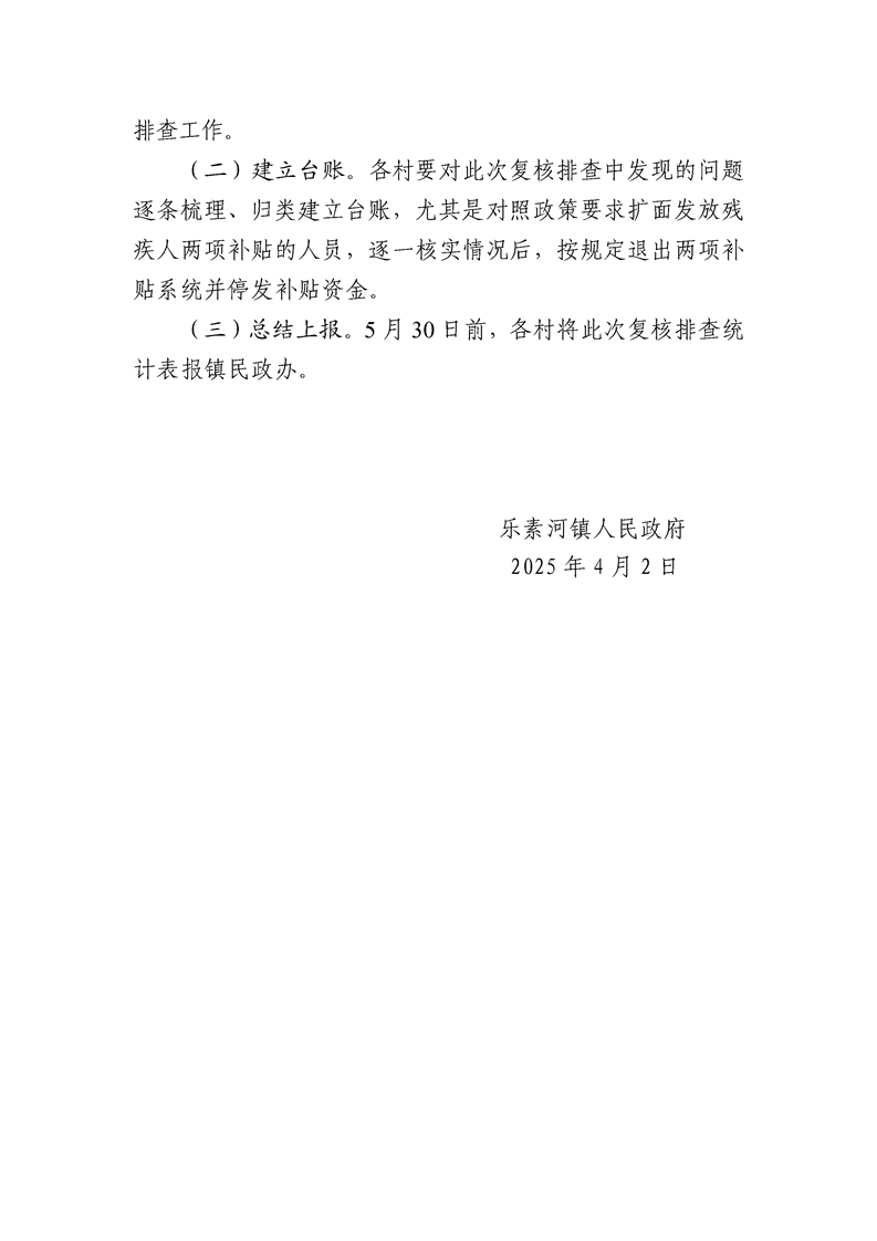 乐素河镇人民政府关于开展2025年残疾人两项补贴对象复核排查工作的通知