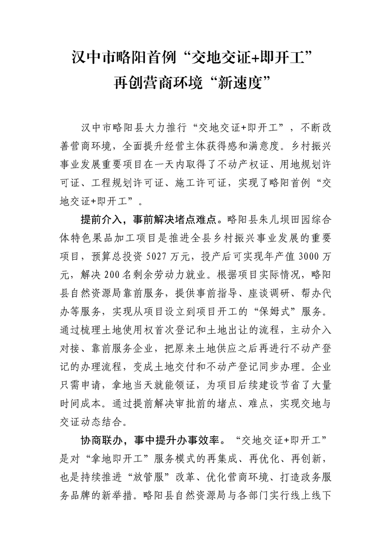 汉中市略阳首例“交地交证+即开工” 再创营商环境“新速度”
