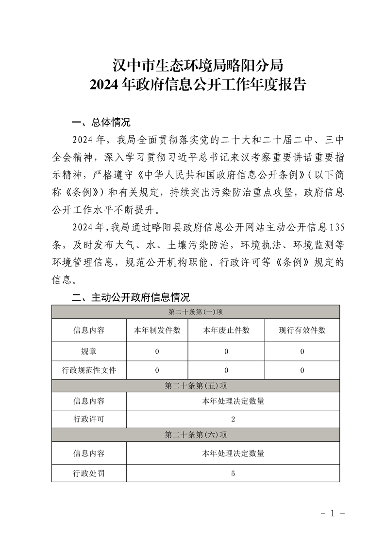 内容概述 | 汉中市生态环境局略阳分局2024年星空彩票官网下载安装工作年度报告 |
