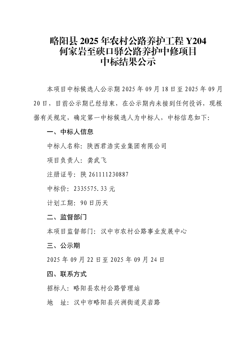 内容概述 | 星空体育首页app2025年农村公路养护工程Y204何家岩至硖口驿公路养护中修项目中标结果公示 |