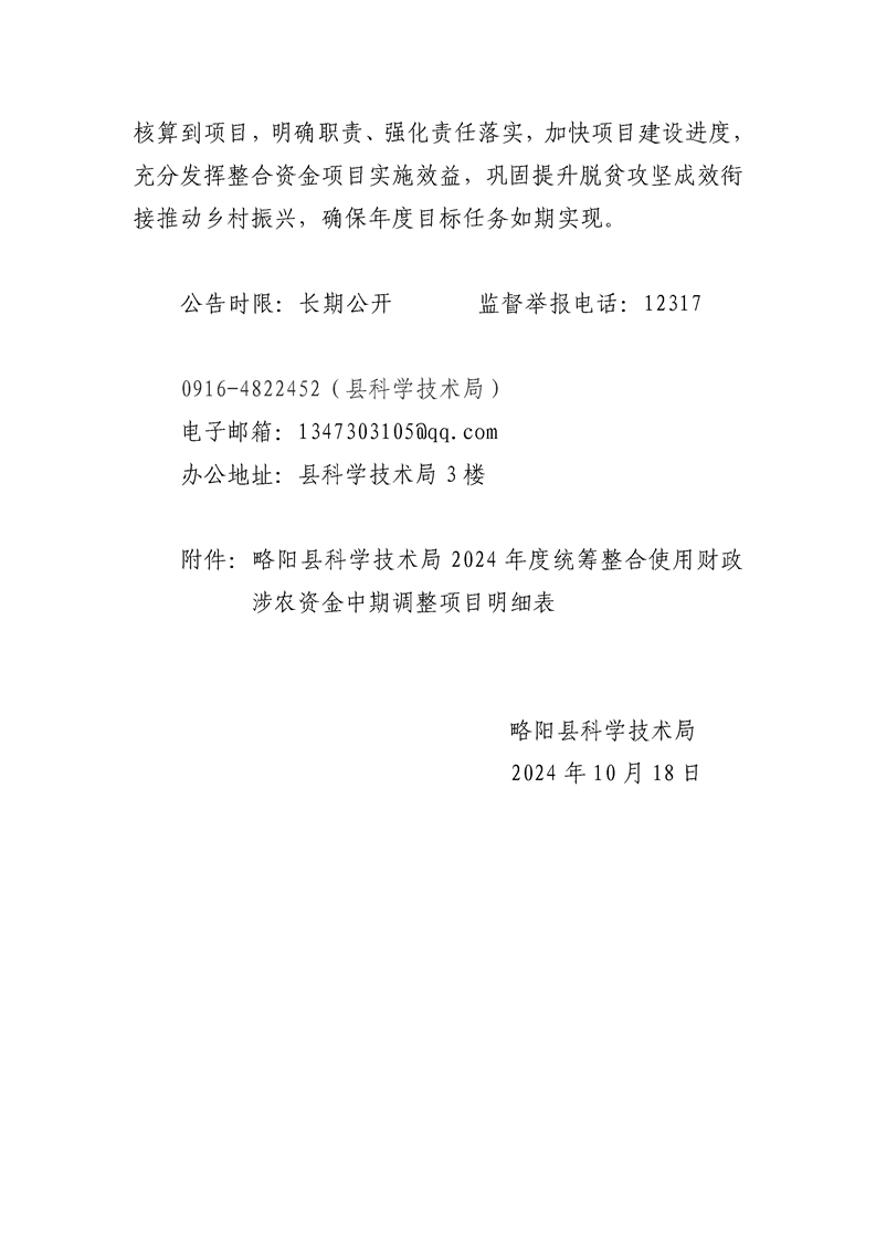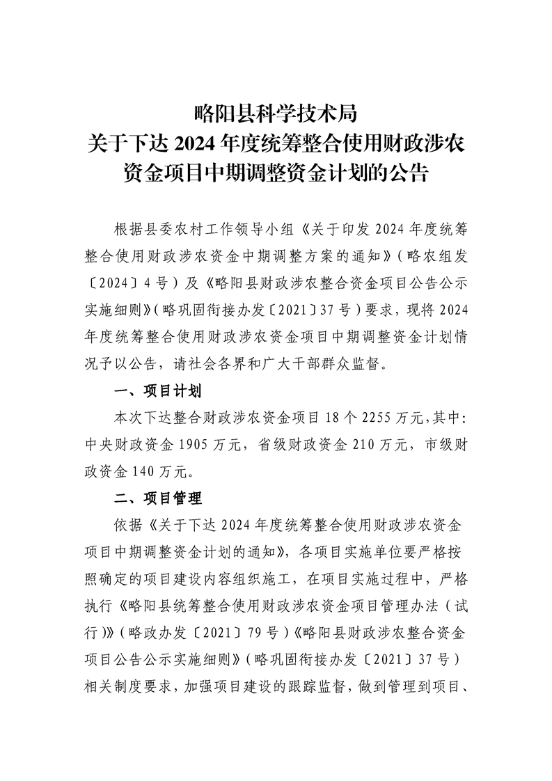 内容概述 | 关于下达2024年度统筹整合使用财政涉农资金项目中期调整资金计划的公告 |