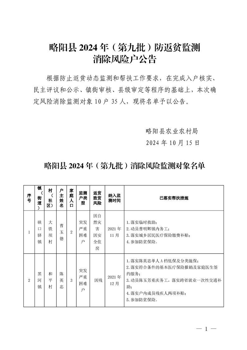 星空体育首页app2024年(第九批)防返贫监测消除风险户公告
