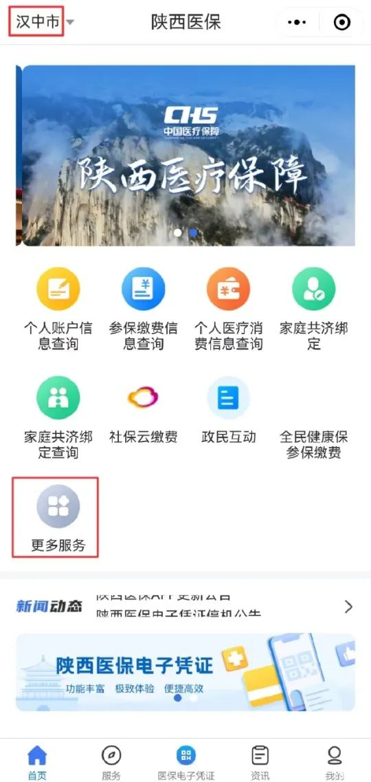 登录“陕西医保”APP或者微信、支付宝里搜索小程序“陕西医保”,授权登录进入主页面,在左上角选择汉中市,点击“更多服务”,点击“个人业务申报”中的“城乡居民参保登记”。