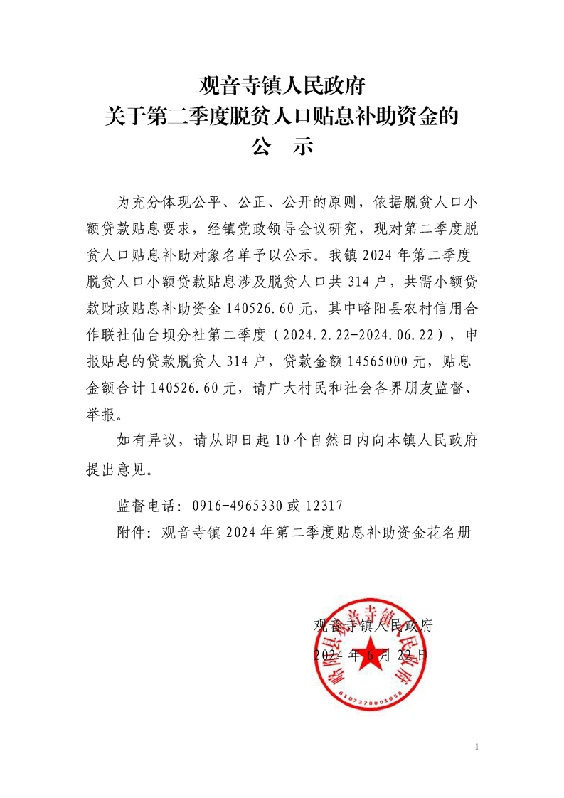 观音寺镇人民政府关于第二季度脱贫人口贴息补助资金的公示