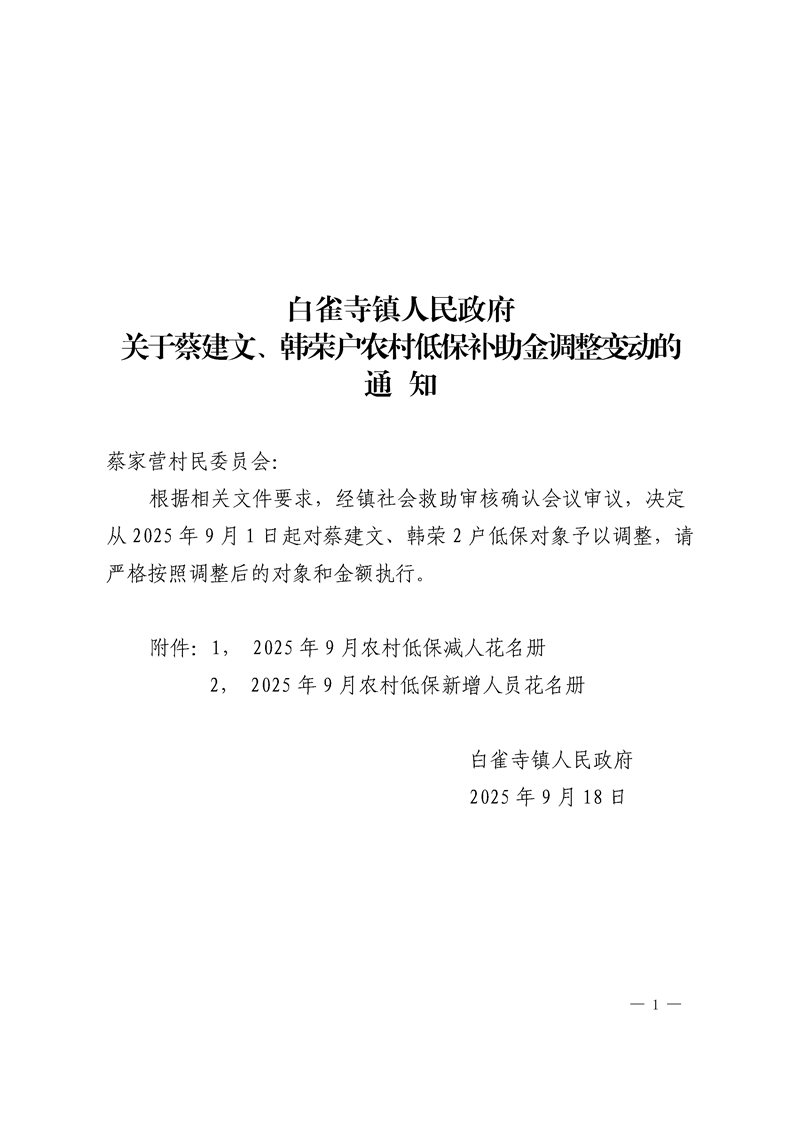 白雀寺镇人民政府关于蔡建文、韩荣户农村低保补助金调整变动的通知