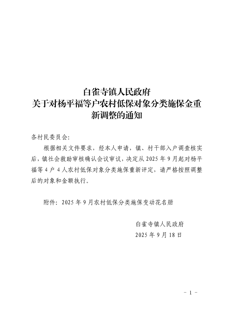 白雀寺镇人民政府关于对杨平福等户农村低保对象分类施保金重新调整的通知