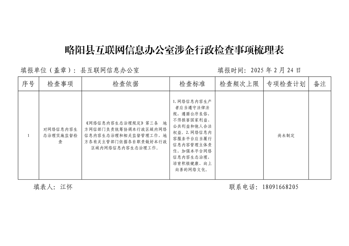 星空体育首页app互联网信息办公室涉企行政检查事项梳理表