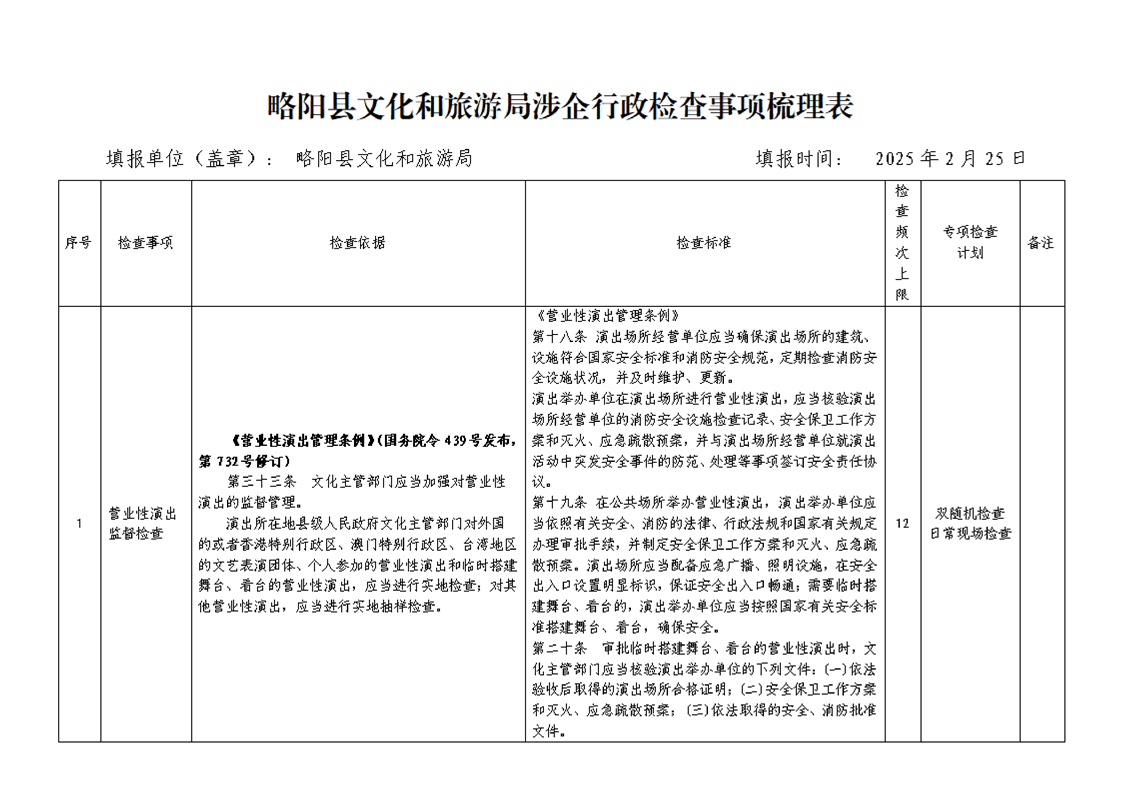 星空体育首页app文化和旅游局涉企行政检查事项梳理表
