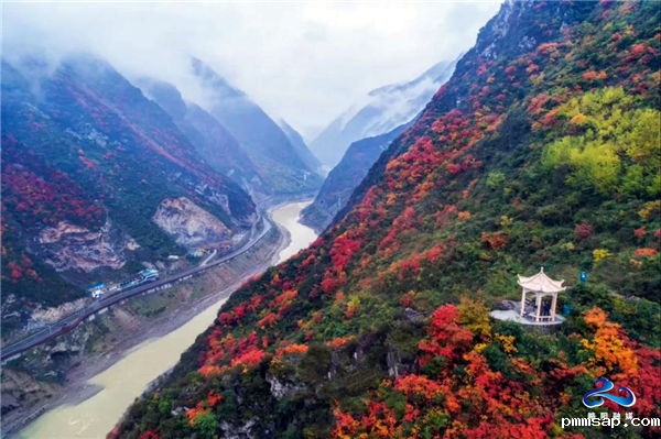 嘉陵江两岸巍峨的悬崖峭壁如披彩缎
